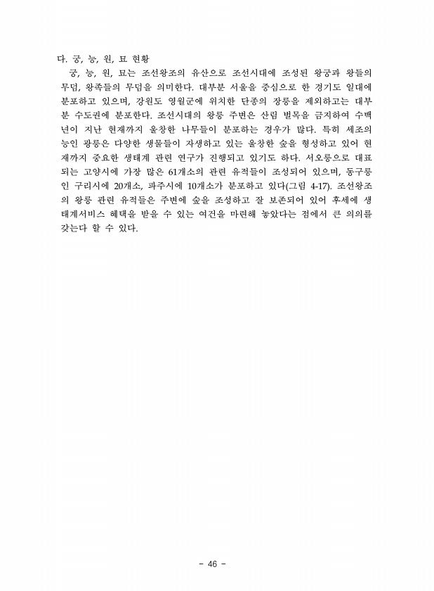 46 다 궁 능 원 묘 현황 궁 능 원 묘는 조선왕조의 유산으로 조선시대에 조성된 왕궁과 왕들의 무덤 왕족들의 무덤을 의미한다 대부분 서울을 중심으로 한 경기도 일대에 분포하고 있으며 강원도 영월군에 위치한 단종의 장릉을 제외하고는 대부 분 수도권에 분포한다 조선시대의 왕릉 주변은 산림 벌목을 금지하여 수백 년이 지난 현재까지 울창한 나무들이 분포하는 경우가 많다 특히 세조의 능인 광릉은 다양한 생물들이 자생하고 있는 울창한 숲을 형성하고 있어 현 재까지 중요한 생태계 관련 연구가 진행되고 있기도 하다 서오릉으로 대표 되는 고양시에 가장 많은 개소의 관련 유적들이 조성되어 있으며 동구릉 인 구리시에 개소 파주시에 개소가 분포하고 있다 그림 조선왕조 의 왕릉 관련 유적들은 주변에 숲을 조성하고 잘 보존되어 있...