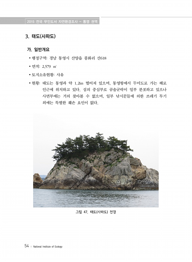 2015 전국 무인도서 자연환경조사 통영 권역 54 ? National Institute of Ecology 3. 태도 사파도 가. 일반개요 ? 행정구역경남 통영시 산양읍 풍화리 산618 ? 면적2,579 ㎡ ? 토지소유현황사유 ? 현황태도는 통영과 약 1.2㎞ 떨어져 있으며, 통영항에서 두미도로 가는 해로 인근에 위치하고 있다. 섬의 중심부로 곰솔군락이 일부 분포하고 있으나 사면부에는 거의 찾아볼 수 없으며, 일부 낚시꾼들에 의한 쓰레기 투기 외에는 특별한 훼손 요인이 없다. 그림 47. 태도 사파도전경