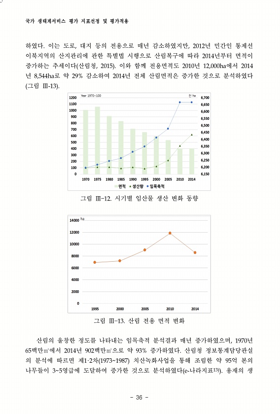 국가 생태계서비스 평가 지표선정 및 평가적용 36 하였다. 이는 도로, 대지 등의 전용으로 매년 감소하였지만, 2012년 민간인 통제선 이북지역의 산지관리에 관한 특별법 시행으로 산림복구에 따라 2014년부터 면적이 증가하는 추세이다 산림청, 2015 이와 함께 전용면적도 2010년 12,000ha에서 2014 년 8,544ha로 약 29% 감소하여 2014년 전체 산림면적은 증가한 것으로 분석하였다 그림 Ⅲ-13 그림 Ⅲ 12. 시기별 임산물 생산 변화 동향 그림 Ⅲ 13. 산림 전용 면적 변화 산림의 울창한 정도를 나타내는 임목축적 분석결과 매년 증가하였으며, 1970년 65백만㎥에서 2014년 902백만㎥으로 약 93% 증가하였다. 산림청 정보통계담당관실 의 분석에 따르면 제1·2차 19731987 치...