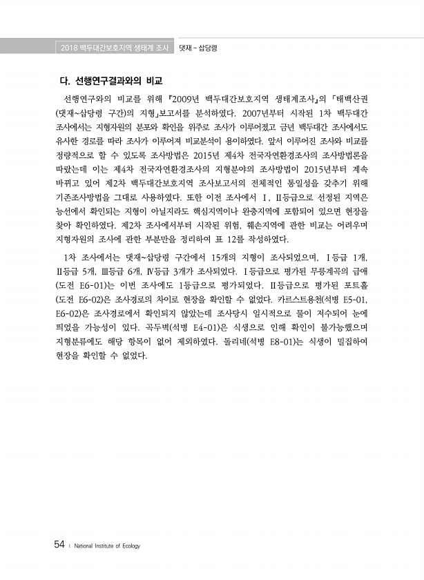 2018 백두대간보호지역 생태계 조사 댓재 삽당령 54 ? National Institute of Ecology 다. 선행연구결과와의 비교 선행연구와의 비교를 위해 『2009년 백두대간보호지역 생태계조사』의 「태백산권 댓재삽당령 구간 의 지형」보고서를 분석하였다. 2007년부터 시작된 1차 백두대간 조사에서는 지형자원의 분포와 확인을 위주로 조사가 이루어졌고 금년 백두대간 조사에서도 유사한 경로를 따라 조사가 이루어져 비교분석이 용이하였다. 앞서 이루어진 조사와 비교를 정량적으로 할 수 있도록 조사방법은 2015년 제4차 전국자연환경조사의 조사방법론을 따랐는데 이는 제4차 전국자연환경조사의 지형분야의 조사방법이 2015년부터 계속 바뀌고 있어 제2차 백두대간보호지역 조사보고서의 전체적인 통일성을 갖추기 위해...