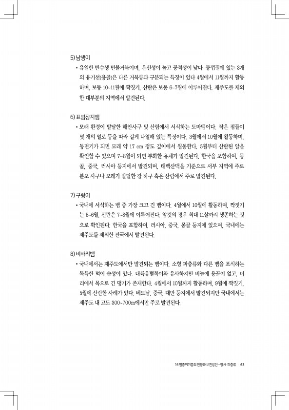 16 멸종위기종의 현황과 보전방안 양서·파충류 63 5 남생이 ?? 유일한 반수생 민물거북이며, 은신성이 높고 공격성이 낮다. 등껍질에 있는 3개 의 융기선 용골 은 다른 거북류과 구분되는 특징이 있다 4월에서 11월까지 활동 하며, 보통 1011월에 짝짓기, 산란은 보통 67월에 이루어진다. 제주도를 제외 한 대부분의 지역에서 발견된다. 6 표범장지뱀 ?? 모래 환경이 발달한 해안사구 및 산림에서 서식하는 도마뱀이다. 작은 점들이 몇 개의 열로 등을 따라 길게 나열해 있는 특징이다. 3월에서 10월에 활동하며, 동면기가 되면 모래 약 17 cm 정도 깊이에서 월동한다. 5월부터 산란된 알을 확인할 수 있으며 78월이 되면 부화한 유체가 발견된다. 한국을 포함하여, 몽 골, 중국, 러시아 등지에서 발견되며,...