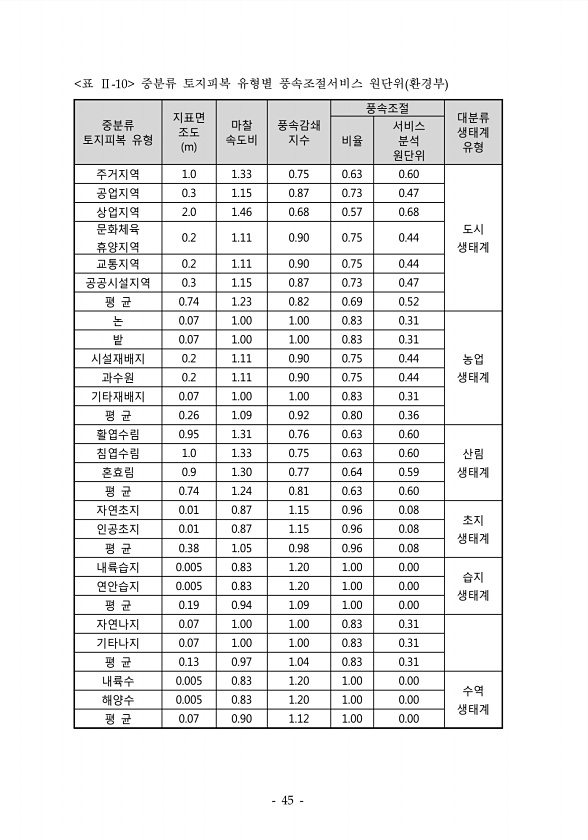 중분류 토지피복 유형 지표면 조도 m 마찰 속도비 풍속감쇄 지수 풍속조절 대분류 생태계 비율 유형 서비스 분석 원단위 주거지역 1.0 1.33 0.75 0.63 0.60 도시 생태계 공업지역 0.3 1.15 0.87 0.73 0.47 상업지역 2.0 1.46 0.68 0.57 0.68 문화체육 휴양지역 0.2 1.11 0.90 0.75 0.44 교통지역 0.2 1.11 0.90 0.75 0.44 공공시설지역 0.3 1.15 0.87 0.73 0.47 평 균 0.74 1.23 0.82 0.69 0.52 논 0.07 1.00 1.00 0.83 0.31 농업 생태계 밭 0.07 1.00 1.00 0.83 0.31 시설재배지 0.2 1.11 0.90 0.75 0.44 과수원 0.2 1.11 0.90 0.75 0.4...