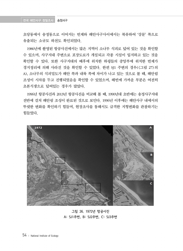 전국 해안사구 정밀조사 송정사구 54 ? National Institute of Ecology 초당동에서 송정동으로 이어지는 빈제와 해안사구사이에서는 북류하여 ?강문? 쪽으로 유출되는 소규모 하천도 확인되었다. 1986년에 촬영된 항공사진에서는 많은 지역이 소나무 식피로 덮여 있는 것을 확인할 수 있으며, 사구지대 주변으로 포장도로가 개설되고 각종 시설이 입지하고 있는 것을 확인할 수 있다. 또한 사구지대의 배후에 위치한 하평들의 중앙부에 위치한 빈제가 경지정리에 의해 사라진 것을 확인할 수 있었다. 한편 SJ1 주변의 경우 그림 27 의 A , 소나무의 식피밀도가 해안 쪽과 내륙 쪽에 차이가 나고 있는 것으로 볼 때, 해안림 조성이 시차를 두고 진행되었음을 확인할 수 있었으며, 해빈에 가까운 부분은 여전히...