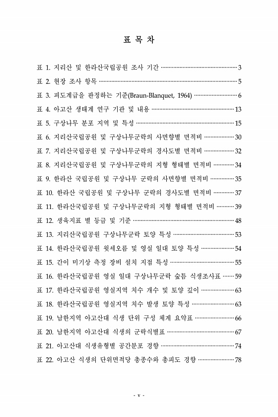 v 표 목 차 표 1. 지리산 및 한라산국립공원 조사 기간 ·················································3 표 2. 현장 조사 항목 ·························································································5 표 3. 피도계급을 판정하는 기준 Braun-Blanquet, 1964 ··························· 6 표 4. 아고산 생태계 연구 기관 및 내용 ·····················································13 표 5. 구상나무 분포 지역 및 특성 ········································...