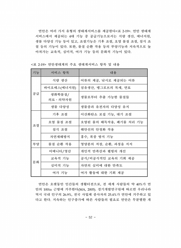 52 기능 서비스 항목 내용 공급 식량 생산 어류의 제공 낚시로 제공되는 어류 바이오매스 에너지원 섬유생산 맹그로브의 목재 연료 생화학물질 의료 의약자원 생물로부터 추출 가능한 물질들 생물 다양성 생물종과 유전자의 다양성 유지 조절 기후 조절 이산화탄소 포집 기능 대기 조절 오염 물질 조절 오염된 물의 해독작용 폐기물 처리 기능 침식 조절 해안선의 안정화 작용 자연재해방지 홍수 폭풍 방지 기능 부양 물질 순환 작용 영양분의 저장 순환 과정을 지지 문화 어메니티 영감 개인적 만족감과 웰빙의 개선 교육적 기능 공식 비공식적인 교육의 기회 제공 심미적 기능 자연의 심미에 대한 만족도 여가 기능 여가 활동에 대한 기회 제공 표 연안생태계의 주요 생태계서비스 항목 및 내용 연안은 여러 가지 유형의 생태계서비스를 제공...