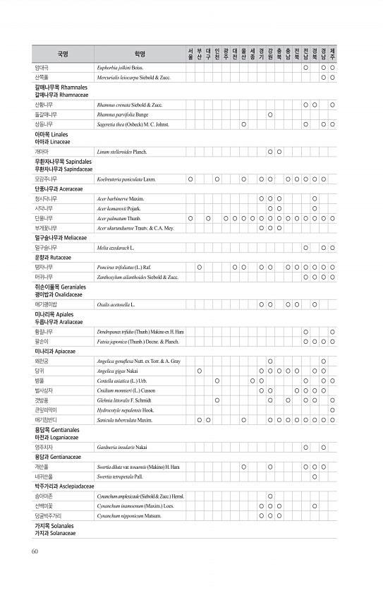 60 암대극 Euphorbia jolkini Boiss. ○ ○ ○ 산쪽풀 Mercurialis leiocarpa Siebold & Zucc. ○ ○ 갈매나무목 Rhamnales 갈매나무과 Rhamnaceae 산황나무 Rhamnus crenata Siebold & Zucc. ○ ○ ○ 돌갈매나무 Rhamnus parvifolia Bunge ○ 상동나무 Sageretia thea Osbeck M. C. Johnst. ○ ○ ○ ○ 아마목 Linales 아마과 Linaceae 개아마 Linum stelleroides Planch. ○ ○ 무환자나무목 Sapindales 무환자나무과 Sapindaceae 모감주나무 Koelreuteria paniculata Laxm. ○ ○ ○ ○ ○ ○ ○ ○ ○ ○ 단풍나무과...