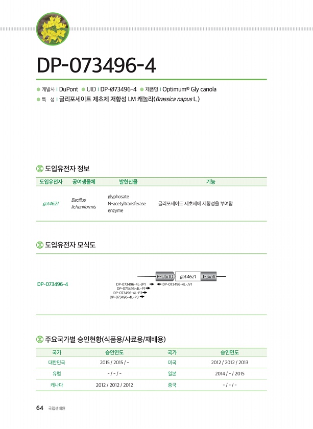 64 국립생태원 ● 개발사ⅠDuPont ● UIDⅠDP-Ø73496-4 ● 제품명ⅠOptimum® Gly canola ● 특 성Ⅰ글리포세이트 제초제 저항성 LM 캐놀라 Brassica napus L. DP-073496-4 주요국가별 승인현황 식품용/사료용/재배용 국가 승인연도 국가 승인연도 대한민국 2015 2015 미국 2012 2012 2013 유럽 일본 2014 2015 캐나다 2012 2012 2012 중국 도입유전자 정보 도입유전자 공여생물체 발현산물 기능 gat4621 Bacillus licheniformis glyphosate N-acetyltransferase enzyme 글리포세이트 제초제에 저항성을 부여함 도입유전자 모식도DP-073496-4