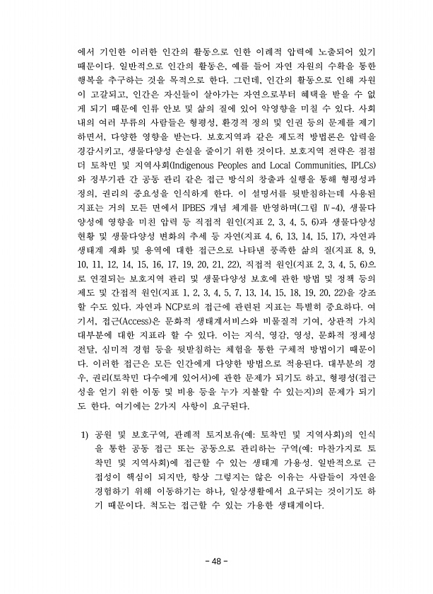 48 에서 기인한 이러한 인간의 활동으로 인한 이례적 압력에 노출되어 있기 때문이다. 일반적으로 인간의 활동은, 예를 들어 자연 자원의 수확을 통한 행복을 추구하는 것을 목적으로 한다. 그런데, 인간의 활동으로 인해 자원 이 고갈되고, 인간은 자신들이 살아가는 자연으로부터 혜택을 받을 수 없 게 되기 때문에 인류 안보 및 삶의 질에 있어 악영향을 미칠 수 있다. 사회 내의 여러 부류의 사람들은 형평성, 환경적 정의 및 인권 등의 문제를 제기 하면서, 다양한 영향을 받는다. 보호지역과 같은 제도적 방법론은 압력을 경감시키고, 생물다양성 손실을 줄이기 위한 것이다. 보호지역 전략은 점점 더 토착민 및 지역사회 Indigenous Peoples and Local Communities, IPLCs 와 정부기관 간 ...