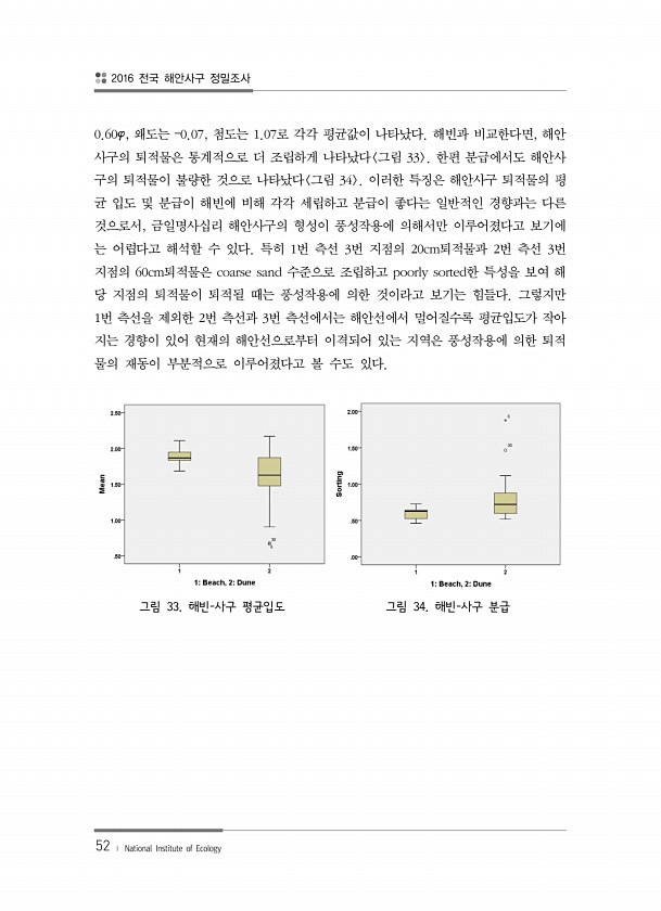 2016 전국 해안사구 정밀조사 52 ? National Institute of Ecology 0.60φ, 왜도는 ?0.07, 첨도는 1.07로 각각 평균값이 나타났다. 해빈과 비교한다면, 해안 사구의 퇴적물은 통계적으로 더 조립하게 나타났다 그림 33 한편 분급에서도 해안사 구의 퇴적물이 불량한 것으로 나타났다 그림 34 이러한 특징은 해안사구 퇴적물의 평 균 입도 및 분급이 해빈에 비해 각각 세립하고 분급이 좋다는 일반적인 경향과는 다른 것으로서, 금일명사십리 해안사구의 형성이 풍성작용에 의해서만 이루어졌다고 보기에 는 어렵다고 해석할 수 있다. 특히 1번 측선 3번 지점의 20cm퇴적물과 2번 측선 3번 지점의 60cm퇴적물은 coarse sand 수준으로 조립하고 poorly sorted한 특성을 보...
