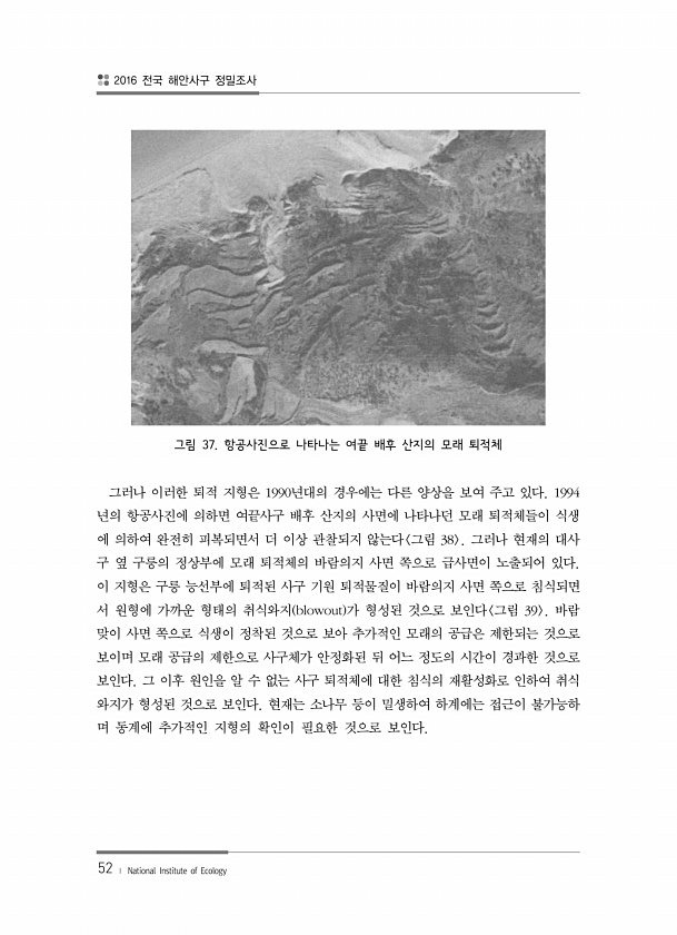 2016 전국 해안사구 정밀조사 52 ? National Institute of Ecology 그림 37. 항공사진으로 나타나는 여끝 배후 산지의 모래 퇴적체 그러나 이러한 퇴적 지형은 1990년대의 경우에는 다른 양상을 보여 주고 있다. 1994 년의 항공사진에 의하면 여끝사구 배후 산지의 사면에 나타나던 모래 퇴적체들이 식생 에 의하여 완전히 피복되면서 더 이상 관찰되지 않는다 그림 38 그러나 현재의 대사 구 옆 구릉의 정상부에 모래 퇴적체의 바람의지 사면 쪽으로 급사면이 노출되어 있다. 이 지형은 구릉 능선부에 퇴적된 사구 기원 퇴적물질이 바람의지 사면 쪽으로 침식되면 서 원형에 가까운 형태의 취식와지 blowout 가 형성된 것으로 보인다 그림 39 바람 맞이 사면 쪽으로 식생이 정착된 것으로 보아...