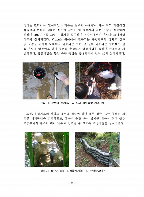 정하는 원리이나, 일시적인 소계류는 갈수기 유출량이 아주 적고 계절적인 유출량의 변화가 심하기 때문에 갈수기 및 평상시의 적은 유량을 계측하기 위하여 2017년 4월 23일 수위계를 설치하여 저수위에서의 유량을 모니터링 하도록 설치되었다. V-notch 위어에서 월류되는 유량자료의 정확도 검토 및 보정을 위하여 노치에서 월류되는 수위 및 실제 월류되는 수위에서 월 류 유량을 양동이로 받아 부피를 측정하는 양동이법을 통하여 관계식을 개 발하였다. 양동이법을 통한 유량 측정은 총 8차례에 걸쳐 40회 실시되었다. 그림 20. 수위계 설치 좌 및 실제 월유유량 계측 우 또한, 유량자료의 정확도 개선을 위하여 위어 내부 평균 10cm 두께의 퇴 적물 제거작업을 실시하였고, 홍수기 유량 손실 방지를 위하여 위어 상부...