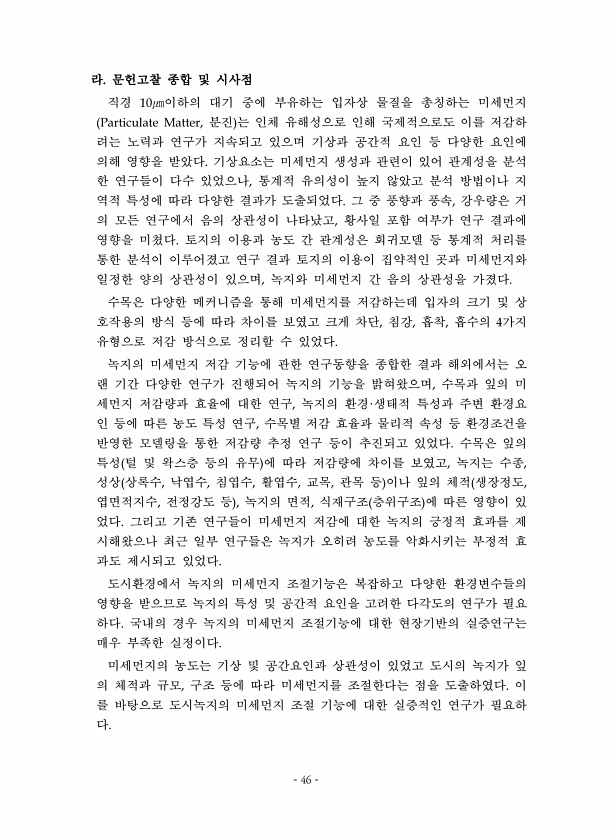 46 라 문헌고찰 종합 및 시사점 직경 이하의 대기 중에 부유하는 입자상 물질을 총칭하는 미세먼지 분진 는 인체 유해성으로 인해 국제적으로도 이를 저감하 려는 노력과 연구가 지속되고 있으며 기상과 공간적 요인 등 다양한 요인에 의해 영향을 받았다 기상요소는 미세먼지 생성과 관련이 있어 관계성을 분석 한 연구들이 다수 있었으나 통계적 유의성이 높지 않았고 분석 방법이나 지 역적 특성에 따라 다양한 결과가 도출되었다 그 중 풍향과 풍속 강우량은 거 의 모든 연구에서 음의 상관성이 나타났고 황사일 포함 여부가 연구 결과에 영향을 미쳤다 토지의 이용과 농도 간 관계성은 회귀모델 등 통계적 처리를 통한 분석이 이루어졌고 연구 결과 토지의 이용이 집약적인 곳과 미세먼지와 일정한 양의 상관성이 있으며 녹지와 미세먼지 간...