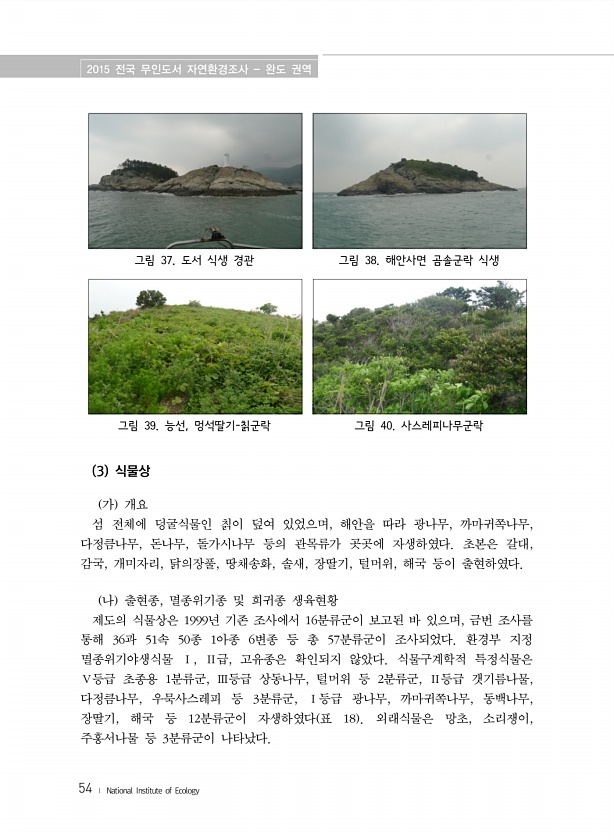 2015 전국 무인도서 자연환경조사 완도 권역 54 ? National Institute of Ecology 그림 37. 도서 식생 경관 그림 38. 해안사면 곰솔군락 식생 그림 39. 능선, 멍석딸기-칡군락 그림 40. 사스레피나무군락 3 식물상 가 개요 섬 전체에 덩굴식물인 칡이 덮여 있었으며, 해안을 따라 광나무, 까마귀쪽나무, 다정큼나무, 돈나무, 돌가시나무 등의 관목류가 곳곳에 자생하였다. 초본은 갈대, 감국, 개미자리, 닭의장풀, 땅채송화, 솔새, 장딸기, 털머위, 해국 등이 출현하였다. 나 출현종, 멸종위기종 및 희귀종 생육현황 제도의 식물상은 1999년 기존 조사에서 16분류군이 보고된 바 있으며, 금번 조사를 통해 36과 51속 50종 1아종 6변종 등 총 57분류군이 조사되었다. 환경부 지...