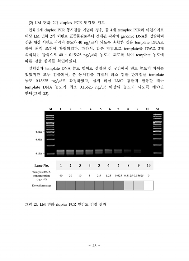 2 LM 면화 2개 duplex PCR 민감도 검토 면화 2개 duplex PCR 동시검출 기법의 경우, 콩 4개 tetraplex PCR과 마찬가지로 대상 LM 면화 2개 이벤트 표준물질로부터 정제된 각각의 genomic DNA를 정량하여 검출 대상 이벤트 각각의 농도가 40 ng/㎕이 되도록 혼합한 것을 template DNA로 하여 최적 조건이 확립되었다. 따라서, 같은 방법으로 template를 DW로 2배 희석하는 방식으로 40 0.15625 ng/㎕의 농도가 되도록 하여 template 농도에 따른 검출 한계를 확인하였다. 실험결과 template DNA 농도 범위로 설정된 전 구간에서 밴드 농도의 차이는 있었지만 모두 검출되어, 본 동시검출 기법의 최소 검출 한계점을 template 농도 0.1...