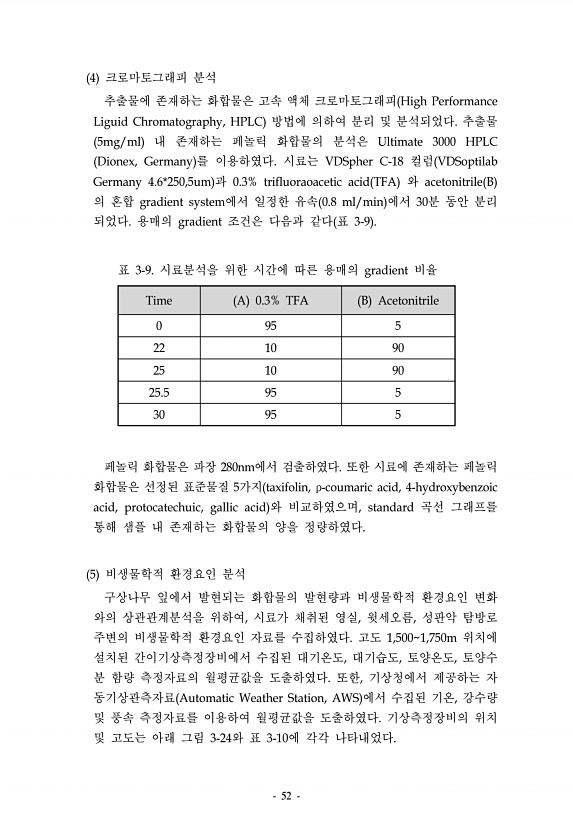 52 4 크로마토그래피 분석 추출물에 존재하는 화합물은 고속 액체 크로마토그래피 High Performance Liguid Chromatography, HPLC 방법에 의하여 분리 및 분석되었다. 추출물 5mg/ml 내 존재하는 페놀릭 화합물의 분석은 Ultimate 3000 HPLC Dionex, Germany 를 이용하였다. 시료는 VDSpher C-18 컬럼 VDSoptilab Germany 4.6*250,5um 과 0.3% trifluoraoacetic acid TFA 와 acetonitrile B 의 혼합 gradient system에서 일정한 유속 0.8 ml/min 에서 30분 동안 분리 되었다. 용매의 gradient 조건은 다음과 같다 표 3-9 Time A 0.3% TFA B Acetoni...