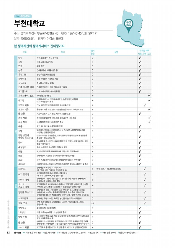 No. 부천- 본 생태자산의 생태계서비스 간이평가지 구분 예시 평가 등급 설명 규모별 혜택 지점 지역 국가 공급 담수 식수, 농업용수, 축산 용수 등 0 √ 식량 곡물, 과실, 물고기 등 0 √ 연료 화목, 토탄 0 √ 섬유 건축용 목재, 의류용 섬유 등 0 √ 유전자원 농업·축산업 희귀품종 등 0 √ 천연약재 전통 의약품에 사용되는 식물 0 √ 장식재료 수집용 조개껍질, 꽃 등 0 √ 진흙,미네랄, 골재 건축용 모래 또는 자갈, 벽돌재료 진흙 등 0 √ 폐기물처리 고체 쓰레기 하치, 폐수 방류 등 0 √ 친환경에너지발전 조력발전, 풍력발전 + √ 조절 대기질 자동차 배기가스, 산업체 대기오염, 농업발생 먼지 등의 대기 미세물질의 제거 + √ 지역적 기후 그늘, 대기온도 저하 등의 지역 미세기후 조절 + √...