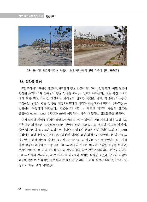 전국 해안사구 정밀조사 맹방사구 54 ? National Institute of Ecology 그림 19. 해안도로와 인접한 하맹방 LMB 지점 좌 과 현재 석축이 덮인 모습 우 나. 퇴적물 특성 7월 조사에서 채취한 맹방해빈퇴적물의 평균 입경이 약 650 ㎛ 인데 반해, 해빈 전면에 형성된 초기사구와 전사구의 평균 입경은 486 ㎛ 정도로 나타났다. 대표 측선 14의 각기 다른 다섯 노두를 대상으로 퇴적물의 입도를 측정한 결과, 맹방사구퇴적층을 구성하는 물질의 평균 입경은 해안으로부터의 거리와 해발고도에 따라서 382-763 ㎛ 범위에서 다양하게 나타났다. 평균은 약 475 ㎛ 정도로 비교적 분급이 양호한 중립사 medium sand; 250-500 ㎛ 에 해당하며, 좌우 대칭적인 입도분포를 보였다. 먼저...