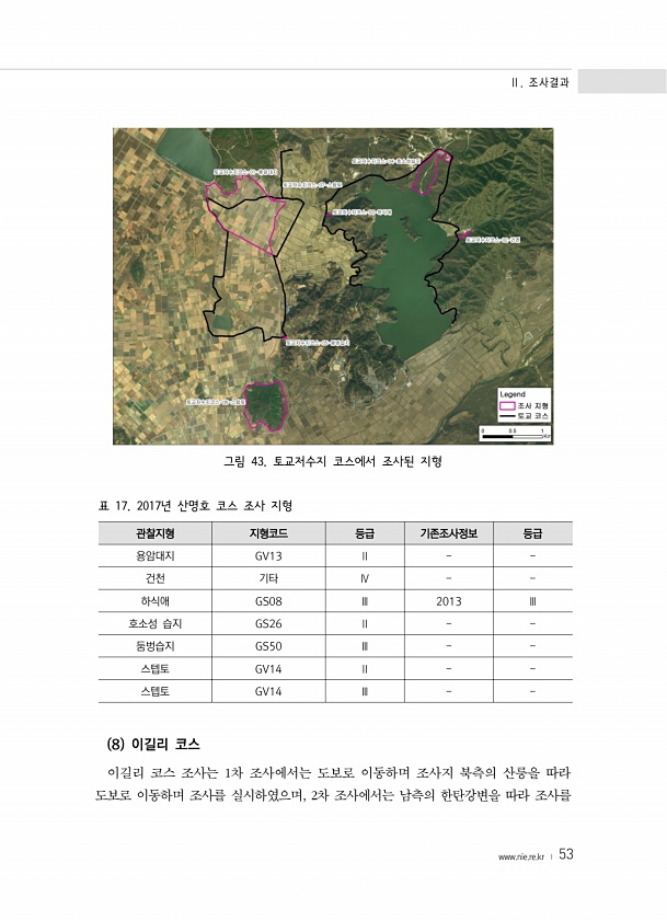 Ⅱ. 조사결과 www.nie.re.kr ? 53 그림 43. 토교저수지 코스에서 조사된 지형 관찰지형 지형코드 등급 기존조사정보 등급 용암대지 GV13 Ⅱ 건천 기타 Ⅳ 하식애 GS08 Ⅲ 2013 Ⅲ 호소성 습지 GS26 Ⅱ 둠벙습지 GS50 Ⅲ 스텝토 GV14 Ⅱ 스텝토 GV14 Ⅲ 표 17. 2017년 산명호 코스 조사 지형 8 이길리 코스 이길리 코스 조사는 1차 조사에서는 도보로 이동하며 조사지 북측의 산릉을 따라 도보로 이동하며 조사를 실시하였으며, 2차 조사에서는 남측의 한탄강변을 따라조사를