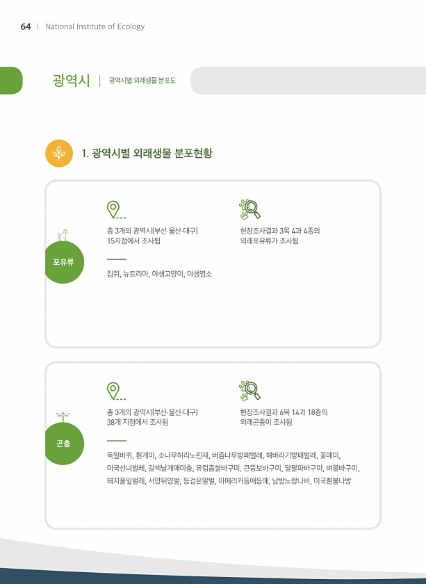 광역시 광역시별 외래생물 분포도 총 3개의 광역시 부산·울산·대구 15지점에서 조사됨 총 3개의 광역시 부산·울산·대구 38개 지점에서 조사됨 현장조사결과 3목 4과 4종의 외래포유류가 조사됨 현장조사결과 6목 14과 18종의 외래곤충이 조사됨 1. 광역시별 외래생물 분포현황 집쥐, 뉴트리아, 야생고양이, 야생염소 독일바퀴, 흰개미, 소나무허리노린재, 버즘나무방패벌레, 해바라기방패벌레, 꽃매미, 미국선녀벌레, 갈색날개매미충, 유럽좁쌀바구미, 큰뚱보바구미, 알팔파바구미, 벼물바구미, 돼지풀잎벌레, 서양뒤영벌, 등검은말벌, 아메리카동애등에, 남방노랑나비, 미국흰불나방 곤충 포유류 64 National Institute ofEcology