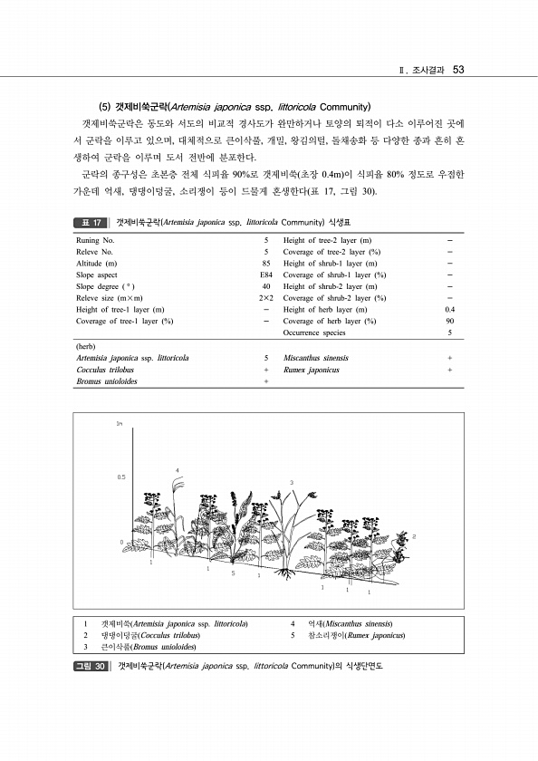 Ⅱ. 조사결과 53 5 갯제비쑥군락 Artemisia japonica ssp. littoricola Community 갯제비쑥군락은 동도와 서도의 비교적 경사도가 완만하거나 토양의 퇴적이 다소 이루어진 곳에 서 군락을 이루고 있으며, 대체적으로 큰이삭풀, 개밀, 왕김의털, 돌채송화 등 다양한 종과 흔히 혼 생하여 군락을 이루며 도서 전반에 분포한다. 군락의 종구성은 초본층 전체 식피율 90%로 갯제비쑥 초장 0.4m 이 식피율 80% 정도로 우점한 가운데 억새, 댕댕이덩굴, 소리쟁이 등이 드물게 혼생한다 표 17, 그림 30 Runing No. 5 Height of tree-2 layer m - Releve No. 5 Coverage of tree-2 layer % - Altitude m 85 Height ...