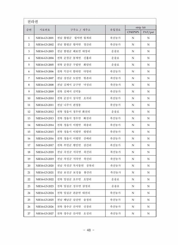 전라권 순번 시료번호 구주소 새주소 유입경로 strip kit CP4EPSPS PAT/pat 1 NIE16-G5-2001 전남 함평군 월야면 월계리 축산농가 N N 2 NIE16-G5-2002 전남 함평군 월야면 정산리 축산농가 N N 3 NIE16-G5-2003 전남 함평군 해보면 대창리 운송로 N N 4 NIE16-G5-2004 전북 순창군 동계면 신흥리 운송로 N N 5 NIE16-G5-2005 전북 순창군 구림면 화암리 운송로 N N 6 NIE16-G5-2006 전북 익산시 함라면 다망리 축산농가 N N 7 NIE16-G5-2007 전남 강진군 도암면 항촌리 축산농가 N N 8 NIE16-G5-2008 전남 김제시 금구면 낙성리 축산농가 N N 9 NIE16-G5-2009 전북 김제시 신덕동 축산농가...
