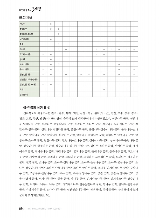 전나무 ○ 측백나무 ○ ○ 측백나무-소나무 ○ 노간주나무 ○ 곰솔 ○ 잣나무 ○ ○ ○ ○ ○ ○ ○ ○ 리기다소나무 ○ ○ ○ ○ ○ ○ 밤나무 ○ ○ 아까시나무 ○ ○ ○ 은사시나무 ○ ○ ○ ○ ○ ○ 일본잎갈나무 ○ ○ ○ ○ ○ ○ ○ ○ ○ ○ ○ ○ ○ 일본잎갈나무-졸참나무 ○ 일본잎갈나무-소나무 ○ ○ ○ 억새 ○ 실새풀-새 ○ ? 전북의 식생 Ⅱ-2 전라북도의 식생조사는 전주 · 완주, 이리 · 익산, 군산 · 옥구, 김제 시 · 군 , 진안, 무주, 장수, 정주 · 정읍, 고창, 부안, 남원 시 · 군 , 임실, 순창의 13개 행정구역에서 수행되었으며, 신갈나무 군락, 신갈나 무-떡갈나무 군락, 신갈나무-상수리나무 군락, 신갈나무-소나무 군락, 신갈나무-노린재나무 군락, 신 갈나무-철쭉 군...