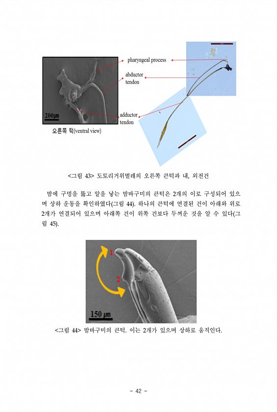 42 그림 43 도토리거위벌레의 오른쪽 큰턱과 내, 외전건 밤에 구멍을 뚫고 알을 낳는 밤바구미의 큰턱은 2개의 이로 구성되어 있으 며 상하 운동을 확인하였다 그림 44 하나의 큰턱에 연결된 건이 아래와 위로 2개가 연결되어 있으며 아래쪽 건이 위쪽 건보다 두꺼운 것을 알 수 있다 그 림 45 그림 44 밤바구미의 큰턱. 이는 2개가 있으며 상하로움직인다.