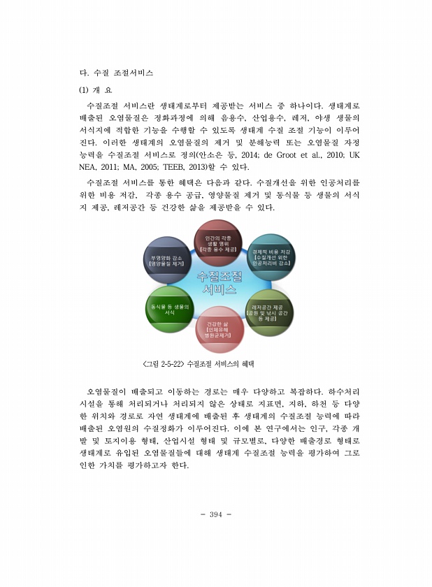 394 다. 수질 조절서비스 1 개 요 수질조절 서비스란 생태계로부터 제공받는 서비스 중 하나이다. 생태계로 배출된 오염물질은 정화과정에 의해 음용수, 산업용수, 레저, 야생 생물의 서식지에 적합한 기능을 수행할 수 있도록 생태계 수질 조절 기능이 이루어 진다. 이러한 생태계의 오염물질의 제거 및 분해능력 또는 오염물질 자정 능력을 수질조절 서비스로 정의 안소은 등, 2014; de Groot et al., 2010; UK NEA, 2011; MA, 2005; TEEB, 2013 할 수 있다. 수질조절 서비스를 통한 혜택은 다음과 같다. 수질개선을 위한 인공처리를 위한 비용 저감, 각종 용수 공급, 영양물질 제거 및 동식물 등 생물의 서식 지 제공, 레저공간 등 건강한 삶을 제공받을 수 있다. 그림 2-5-...