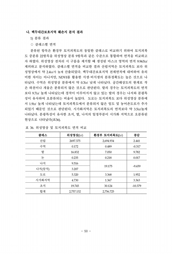 50 나. 백두대간보호지역 훼손지 분석 결과 1 분류 결과 ○ 클래스별 면적 분류된 항목은 환경부 토지피복도의 동일한 클래스로 비교하기 위하여 토지피복 도 중분류 22항목을 위성영상 분류 9항목과 같은 수준으로 통합하여 면적을 비교하고 자 하였다. 위성영상 전처리 시 구름을 제거할 때 생성된 마스크 영역의 면적 9.963㎢ 제외하고 분석하였다. 클래스별 면적을 비교한 결과 산림지역은 토지피복도 보다 위 성영상에서 약 2.4㎢가 높게 산출되었다. 백두대간보호지역 전체면적에 대비하여 유의 미한 차이는 아니지만, NDVI를 활용한 식생·비식생의 분류정확도는 높은 것으로 나 타났다. 수역은 위성영상 분류에서 약 0.3㎢ 낮게 나타났다. 공간해상도의 한계로 작 은 하천이나 개울은 분류되지 않은 것으로 판단된다. 밭의...