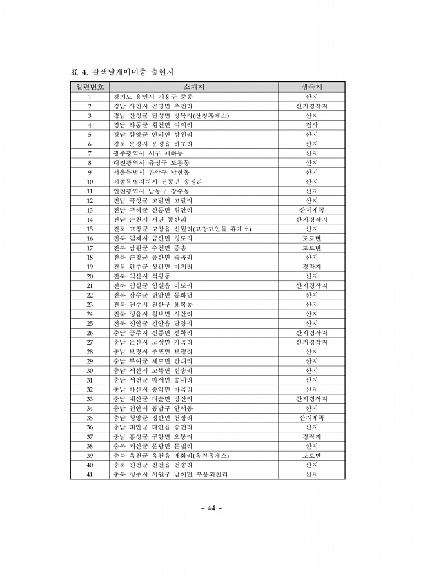 44 일련번호 소재지 생육지 1 경기도 용인시 기흥구 중동 산지 2 경남 사천시 곤명면 추천리 산지경작지 3 경남 산청군 단성면 방목리 산청휴게소 산지 4 경남 하동군 횡천면 여의리 경작 5 경남 함양군 안의면 상원리 산지 6 경북 문경시 문경읍 하초리 산지 7 광주광역시 서구 세하동 산지 8 대전광역시 유성구 도룡동 산지 9 서울특별시 관악구 남현동 산지 10 세종특별자치시 전동면 송정리 산지 11 인천광역시 남동구 장수동 산지 12 전남 곡성군 고달면 고달리 산지 13 전남 구례군 산동면 위안리 산지계곡 14 전남 순천시 서면 동산리 산지경작지 15 전북 고창군 고창읍 신월리 고창고인돌 휴게소 산지 16 전북 김제시 금산면 청도리 도로변 17 전북 남원군 추천면 중송 도로변 18 전북 순창군 풍산면 죽곡...