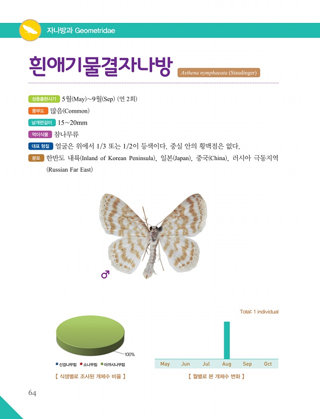 64 자나방과 Geometridae 성충출현시기 5월 May 9월 Sep 연 2회 풍부도 많음 Common 날개편길이 1520mm 먹이식물 참나무류 대표 형질 얼굴은 위에서 1/3 또는 1/2이 등색이다. 중실 안의 횡맥점은 없다. 분포 한반도 내륙 Inland of Korean Peninsula , 일본 Japan , 중국 China , 러시아 극동지역 Russian Far East 흰애기물결자나방 Asthena nymphaeata Staudinger 【 식생별로 조사된 개체수 비율 】 100% 신갈나무림 소나무림 아까시나무림 【 월별로 본 개체수 변화 】 Total1 individual May Jun Jul Aug SepOct