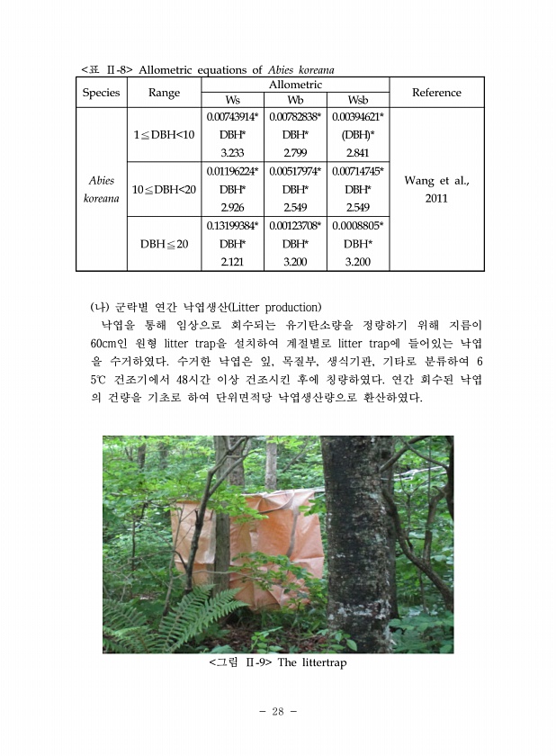 28 표 Ⅱ-8 Allometric equations of Abies koreana Species Range Allometric Reference Ws Wb Wsb Abies koreana 1?DBH 10 0.00743914* DBH* 3.233 0.00782838* DBH* 2.799 0.00394621* DBH * 2.841 Wang et al., 2011 10?DBH 20 0.01196224* DBH* 2.926 0.00517974* DBH* 2.549 0.00714745* DBH* 2.549 DBH?20 0.13199384* DBH* 2.121 0.00123708* DBH* 3.200 0.0008805* DBH* 3.200 나 군락별 연간 낙엽생산 Litter production 낙엽을 통해 임상으로...