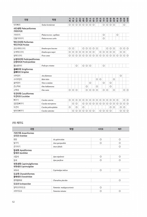 62 되지빠귀 Turdus hortulorum ○ ○ ○ ○ ○ ○ ○ ○ ○ ○ ○ ○ ○ 사다새목 Pelecaniformes 가마우지과 가마우지 Phalacrocorax capillatus ○ ○ 민물가마우지 Phalacrocorax carbo ○ 딱다구리목 Piciformes 딱다구리과 Picidae 큰오색딱다구리 Dendrocopos leucotos ○ ○ ○ ○ ○ ○ ○ ○ ○ ○ ○ ○ ○ 오색딱다구리 Dendrocopos major ○ ○ ○ ○ ○ ○ ○ ○ ○ ○ ○ ○ ○ ○ ○ 청딱다구리 Picus canus ○ ○ ○ ○ ○ ○ ○ ○ ○ ○ ○ ○ ○ ○ ○ ○ ○ ○ 논병아리목 Podicipediformes 논병아리과 Podicipedidae 뿔논병아리 Podiceps crista...