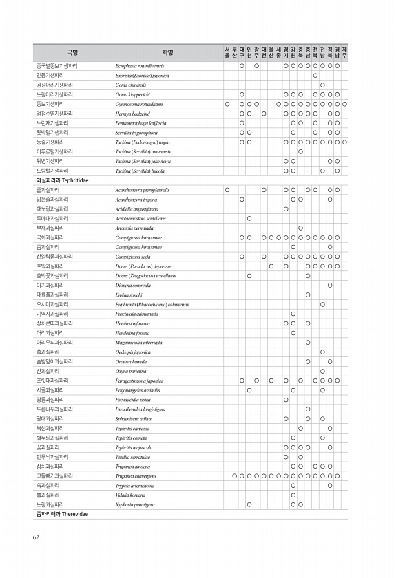 62 중국별뚱보기생파리 Ectophasia rotundiventris ○ ○ ○ ○ ○ ○ ○ ○ ○ ○ 긴등기생파리 Exorista Exorista japonica ○ 검정머리기생파리 Gonia chinensis ○ 노랑머리기생파리 Gonia klapperichi ○ ○ ○ ○ ○ ○ ○ ○ 뚱보기생파리 Gymnosoma rotundatum ○ ○ ○ ○ ○ ○ ○ ○ ○ ○ ○ ○ ○ ○ 검정수염기생파리 Hermya beelzebul ○ ○ ○ ○ ○ ○ ○ ○ ○ ○ 노린재기생파리 Pentatomophaga latifascia ○ ○ ○ ○ ○ ○ 됫박털기생파리 Servillia trigonophora ○ ○ ○ ○ ○ ○ 등줄기생파리 Tachina Eudoromyia nupta ○ ○ ○ ○ ○ ○ ...