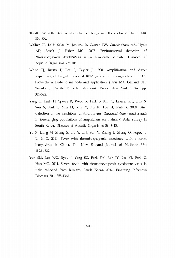 53 Thuiller W. 2007. BiodiversityClimate change and the ecologist. Nature 448550-552. Walker SF, Baldi Salas M, Jenkins D, Garner TW, Cunningham AA, Hyatt AD, Bosch J, Fisher MC. 2007. Environmental detection of Batrachochytrium dendrobatidis in a temperate climate. Diseases of Aquatic Organisms 77105. White TJ, Bruns T, Lee S, Tayler J. 1990. Amplification and direct sequencing of fungal ribosoma...