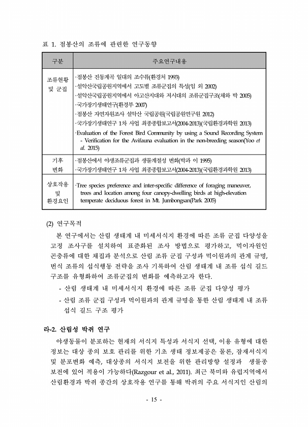 15 구분 주요연구내용 조류현황 및 군집 ·점봉산 진동계곡 일대의 조수류 환경처 1993 ·설악산국립공원지역에서 고도별 조류군집의 특성 임 외 2002 ·설악산국립공원지역에서 아고산지대와 저시대의 조류군집구조 채와 박 2005 ·국가장기생태연구 환경부 2007 ·점봉산 자연자원조사 설악산 국립공원 국립공원연구원 2012 ·국가장기생태연구 1차 사업 최종종합보고서 2004-2013 국립환경과학원 2013 ·Evaluation of the Forest Bird Community by using a Sound Recording System Verification for the Avifauna evaluation in the non-breeding season Yoo et al. 2015 기후 변화 ·점봉산에서 야...