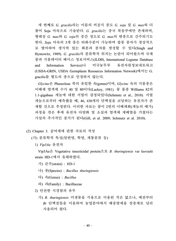 40 세 번째로 G. gracilis라는 이름의 비공식 종도 G. soja 및 G. max와 더 불어 Soja 아속으로 기술된다. G. gracilis는 중국 북동부에만 존재하며, 형태상 G. max와 G. soja의 중간 정도로 G. max의 변종으로 간주되기도 한다. Soja 아속의 3개 종은 타화수분이 가능하며 잡종 종자가 정상적으 로 발아하여 생식력 있는 화분과 종자를 생성할 수 있다 Singh and Hymowitz, 1989 G. gracilis의 분류학적 위치는 논란이 되어왔으며 국제 콩과 식물데이터 베이스 정보서비스 ILDIS, International Legume Database and Information Service 나 미국농무부 유전자원정보네트워크 USDA-GRIN, USDA Germ...