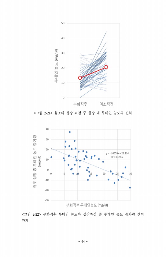 그림 2-21 유조의 성장 과정 중 혈장 내 루테인 농도의 변화 그림 2-22 부화직후 루테인 농도와 성장과정 중 루테인 농도 증가량 간의 관계 44