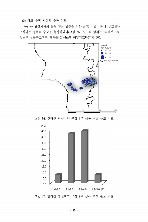 42 3 좌표 수집 지점의 수목 현황 한라산 영실지역의 촬영 결과 검증을 위한 좌표 수집 지점에 분포하는 구상나무 생목의 수고를 측정하였다 그림 36 수고의 범위는 1m에서 5m 범위로 구분하였으며, 대부분 2∼4m에 해당되었다 그림 37 그림 36. 한라산 영실지역 구상나무 생목 수고 분포 지도 그림 37. 한라산 영실지역 구상나무 생목 수고 분포비율