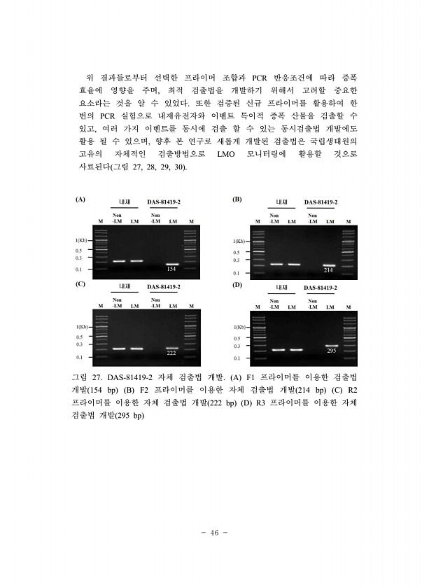46 위 결과들로부터 선택한 프라이머 조합과 PCR 반응조건에 따라 증폭 효율에 영향을 주며, 최적 검출법을 개발하기 위해서 고려할 중요한 요소라는 것을 알 수 있었다. 또한 검증된 신규 프라이머를 활용하여 한 번의 PCR 실험으로 내재유전자와 이벤트 특이적 증폭 산물을 검출할 수 있고, 여러 가지 이벤트를 동시에 검출 할 수 있는 동시검출법 개발에도 활용 될 수 있으며, 향후 본 연구로 새롭게 개발된 검출법은 국립생태원의 고유의 자체적인 검출방법으로 LMO 모니터링에 활용할 것으로 사료된다 그림 27, 28, 29, 30 그림 27. DAS-81419-2 자체 검출법 개발. A F1 프라이머를 이용한 검출법 개발 154 bp B F2 프라이머를 이용한 자체 검출법 개발 214 bp C R2 프라이머를 이용...