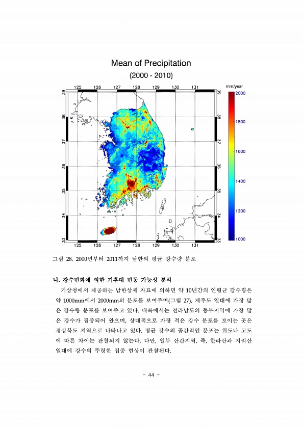 44 그림 28. 2000년부터 2011까지 남한의 평균 강수량 분포 나. 강수변화에 의한 기후대 변동 가능성 분석 기상청에서 제공하는 남한상세 자료에 의하면 약 10년간의 연평균 강수량은 약 1000mm에서 2000mm의 분포를 보여주며 그림 27 , 제주도 일대에 가장 많 은 강수량 분포를 보여주고 있다. 내륙에서는 전라남도의 동부지역에 가장 많 은 강수가 집중되어 왔으며, 상대적으로 가장 적은 강수 분포를 보이는 곳은 경상북도 지역으로 나타나고 있다. 평균 강수의 공간적인 분포는 위도나 고도 에 따른 차이는 관찰되지 않는다. 다만, 일부 산간지역, 즉, 한라산과 지리산 일대에 강수의 뚜렷한 집중 현상이관찰된다.