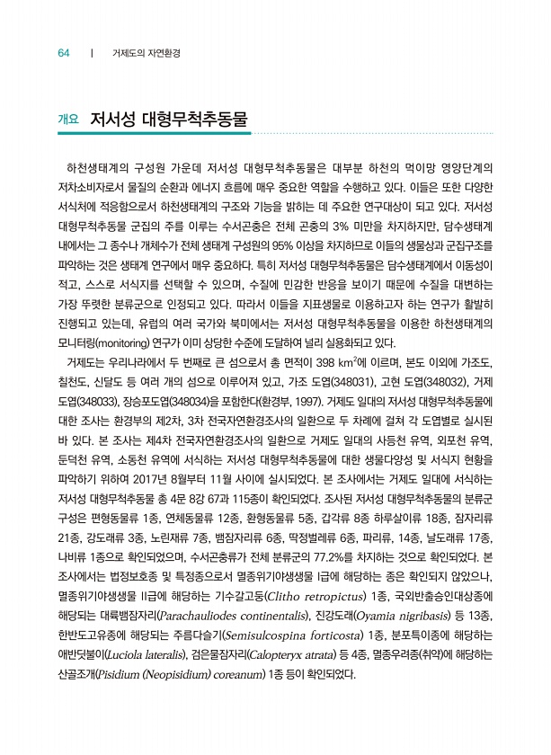 64 ┃ 거제도의 자연환경 개요 저서성 대형무척추동물 하천생태계의 구성원 가운데 저서성 대형무척추동물은 대부분 하천의 먹이망 영양단계의 저차소비자로서 물질의 순환과 에너지 흐름에 매우 중요한 역할을 수행하고 있다. 이들은 또한 다양한 서식처에 적응함으로서 하천생태계의 구조와 기능을 밝히는 데 주요한 연구대상이 되고 있다. 저서성 대형무척추동물 군집의 주를 이루는 수서곤충은 전체 곤충의 3% 미만을 차지하지만, 담수생태계 내에서는 그 종수나 개체수가 전체 생태계 구성원의 95% 이상을 차지하므로 이들의 생물상과 군집구조를 파악하는 것은 생태계 연구에서 매우 중요하다. 특히 저서성 대형무척추동물은 담수생태계에서 이동성이 적고, 스스로 서식지를 선택할 수 있으며, 수질에 민감한 반응을 보이기 때문에 수질을 대변하...