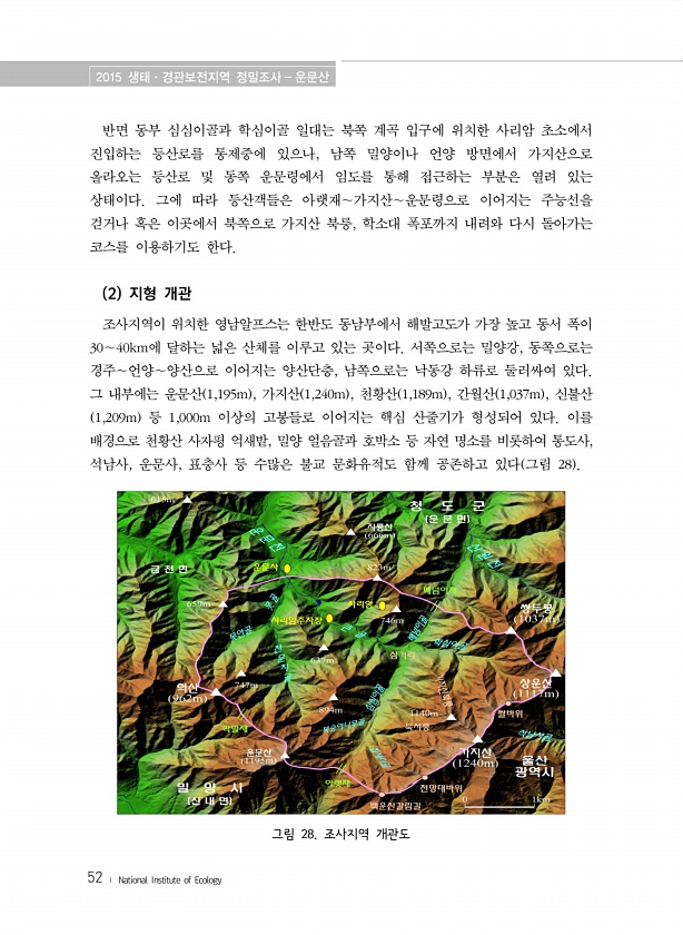 2015 생태·경관보전지역 정밀조사 운문산 52 ? National Institute of Ecology 반면 동부 심심이골과 학심이골 일대는 북쪽 계곡 입구에 위치한 사리암 초소에서 진입하는 등산로를 통제중에 있으나, 남쪽 밀양이나 언양 방면에서 가지산으로 올라오는 등산로 및 동쪽 운문령에서 임도를 통해 접근하는 부분은 열려 있는 상태이다. 그에 따라 등산객들은 아랫재∼가지산∼운문령으로 이어지는 주능선을 걷거나 혹은 이곳에서 북쪽으로 가지산 북릉, 학소대 폭포까지 내려와 다시 돌아가는 코스를 이용하기도 한다. 2 지형 개관 조사지역이 위치한 영남알프스는 한반도 동남부에서 해발고도가 가장 높고 동서 폭이 30∼40km에 달하는 넓은 산체를 이루고 있는 곳이다. 서쪽으로는 밀양강, 동쪽으로는 경주∼언양∼양산으...