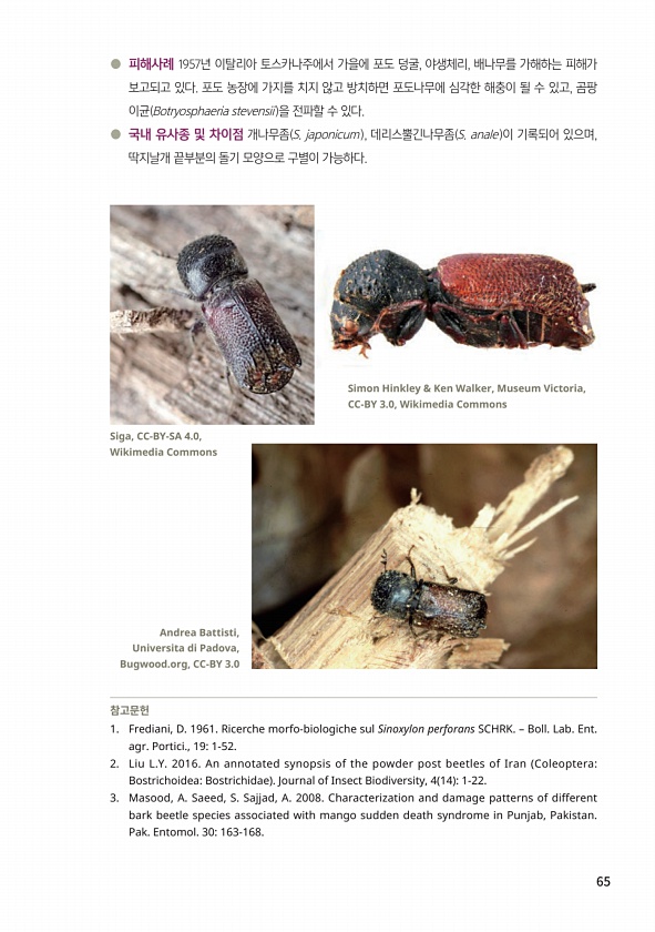65 ● 피해사례 1957년 이탈리아 토스카나주에서 가을에 포도 덩굴, 야생체리, 배나무를 가해하는 피해가 보고되고 있다. 포도 농장에 가지를 치지 않고 방치하면 포도나무에 심각한 해충이 될 수 있고, 곰팡 이균 Botryosphaeria stevensii 을 전파할 수 있다. ● 국내 유사종 및 차이점 개나무좀 S. japonicum , 데리스뿔긴나무좀 S. anale 이 기록되어 있으며, 딱지날개 끝부분의 돌기 모양으로 구별이 가능하다. 참고문헌 1. Frediani, D. 1961. Ricerche morfo-biologiche sul Sinoxylon perforans SCHRK. ? Boll. Lab. Ent. agr. Portici., 191-52. 2. Liu L.Y. 2016. An annot...