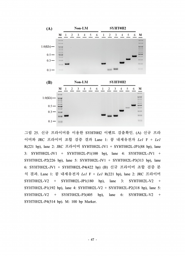 47 그림 25. 신규 프라이머를 이용한 SYHT0H2 이벤트 검출확인. A 신규 프라 이머와 JRC 프라이머 조합 검증 결과 Lane 1콩 내재유전자 Le1 F + Le1 R 221 bp , lane 2JRC 프라이머 SYHT0H2L-JV1 + SYHT0H2L-JP1 88 bp , lane 3SYHT0H2L-JV1 + SYHT0H2L-P1 100 bp , lane 4SYHT0H2L-JV1 + SYHT0H2L-P2 226 bp , lane 5SYHT0H2L-JV1 + SYHT0H2L-P3 313 bp , lane 6SYHT0H2L-JV1 + SYHT0H2L-P4 422 bp B 신규 프라이머 조합 검증 분 석 결과. Lane 1콩 내재유전자 Le1 F + Le1 R 221 bp , lane 2JRC 프라이머...