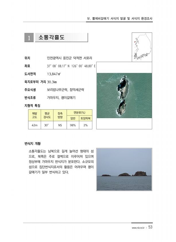 Ⅳ. 뿔제비갈매기 서식지 발굴 및 서식지 환경조사 www.nie.re.kr ? 53 1 소통각흘도 위치 인천광역시 옹진군 덕적면 서포리 좌표 37°08′08.17″N 126°00′48.80″E 도서면적 13,847㎡ 육지로부터 거리 30.3㎞ 주요식생 보리밥나무군락, 참억새군락 번식조류 가마우지, 괭이갈매기 지형적 특징 해발 고도 평균 경사도 장축 방향 면분류 % 암반 토양피복 42m 30° NS 98% 2% 번식지 개황 소통각흘도는 남북으로 길게 늘어선 형태의 섬 으로, 북쪽은 주로 절벽으로 이루어져 있으며 정상부에 가마우지 번식지가 분포한다. 소규모의 섬으로 집단번식지로서의 활용은 어려우며 괭이 갈매기가 일부 번식하고있다.