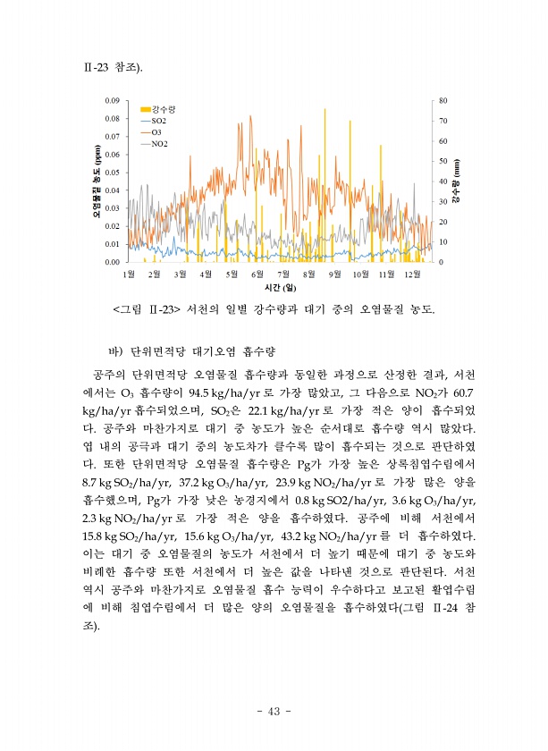 43 참조 그림 서천의 일별 강수량과 대기 중의 오염물질 농도 바 단위면적당 대기오염 흡수량 공주의 단위면적당 오염물질 흡수량과 동일한 과정으로 산정한 결과 서천 에서는 흡수량이 로 가장 많았고 그 다음으로 가 흡수되었으며 은 로 가장 적은 양이 흡수되었 다 공주와 마찬가지로 대기 중 농도가 높은 순서대로 흡수량 역시 많았다 엽 내의 공극과 대기 중의 농도차가 클수록 많이 흡수되는 것으로 판단하였 다 또한 단위면적당 오염물질 흡수량은 가 가장 높은 상록침엽수림에서 로 가장 많은 양을 흡수했으며 가 가장 낮은 농경지에서 로 가장 적은 양을 흡수하였다 공주에 비해 서천에서 를 더 흡수하였다 이는 대기 중 오염물질의 농도가 서천에서 더 높기 때문에 대기 중 농도와 비례한 흡수량 또한 서천에서 더 높은 값을 나타낸...