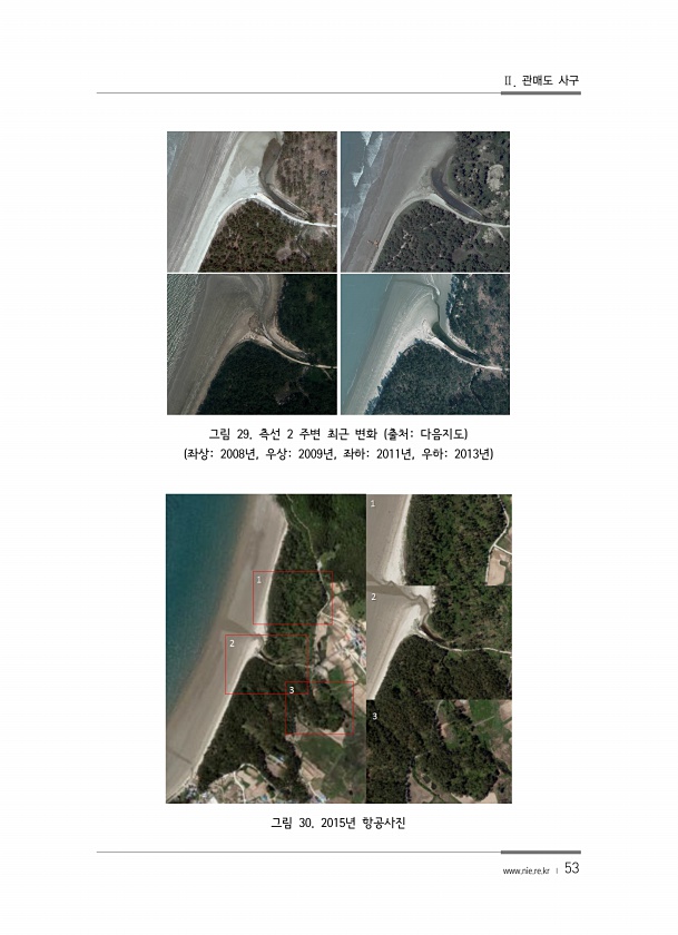 Ⅱ. 관매도 사구 www.nie.re.kr ? 53 그림 29. 측선 2 주변 최근 변화 출처다음지도 좌상2008년, 우상2009년, 좌하2011년, 우하2013년 그림 30. 2015년항공사진