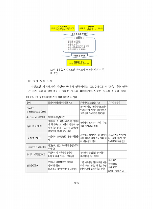 395 그림 2-5-23 수질조절 서비스에 영향을 미치는 주 요 요인 2 평가 방법 고찰 수질조절 가치평가와 관련한 국내외 연구사례는 표 2-5-13 과 같다. 이들 연구 는 크게 물리적 변화량을 산정하는 지표와 화폐가치로 도출한 지표를 이용해 왔다. 출처 물리적 변화량을 산정한 지표 화폐가치로 도출한 지표 가치산정결과 Emerton & Kekulandala, 2003 폐수처리비용, 병원비지출 오염과 인간의 관계규명에는 불충분한 자 료로 실제 가치추정은 안되었음 de Groot et al. 2010 탈질소작용 kgN/ha/y layke et al. 2012 생태계의 오·폐수 처리능력, 생태계 가 처리하는 오·폐수의 양 단위부 피/폐기물 질량 , 지표수 내 오염물질 농도 단위오염물질별 다양 생태계의 오·폐수 ...