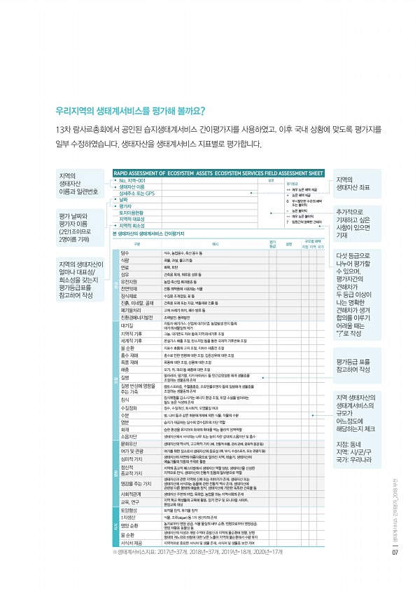 우리 지역의 생태계서비스를 평가해 볼까요? 13차 람사르총회에서 공인된 습지생태계서비스 간이평가지를 사용하였고, 이후 국내 상황에 맞도록 평가지를 일부 수정하였습니다. 생태자산을 생태계서비스 지표별로 평가합니다. RAPID ASSESSMENT OF ECOSYSTEM ASSETS ECOSYSTEM SERVICES FIELD ASSESSMENT SHEET No. 지역-001 설명 평가등급 ++ 매우 높은 혜택 제공 + 높은 혜택 제공 0 무시할만한 수준의 혜택 또는 불이익 높은 불이익 -- 매우 높은 불이익 ? 팀원간의 명확한 견해차 생태자산 이름 상세주소 또는 GPS 날짜 평가자 토지이용현황 지역적 대표성 지역적 희소성 본 생태자산의 생태계서비스 간이평가지 구분 예시 평가 등급 설명 규모별 혜택 지점 지역 국...
